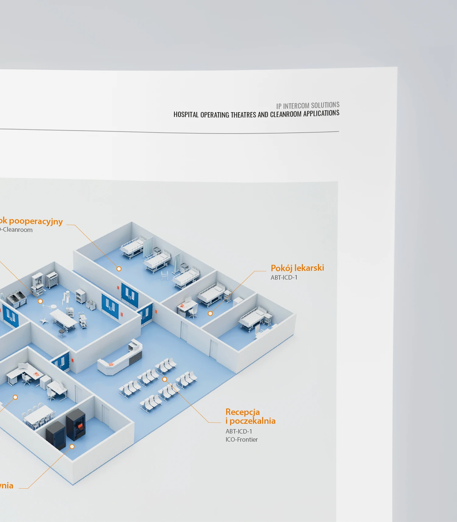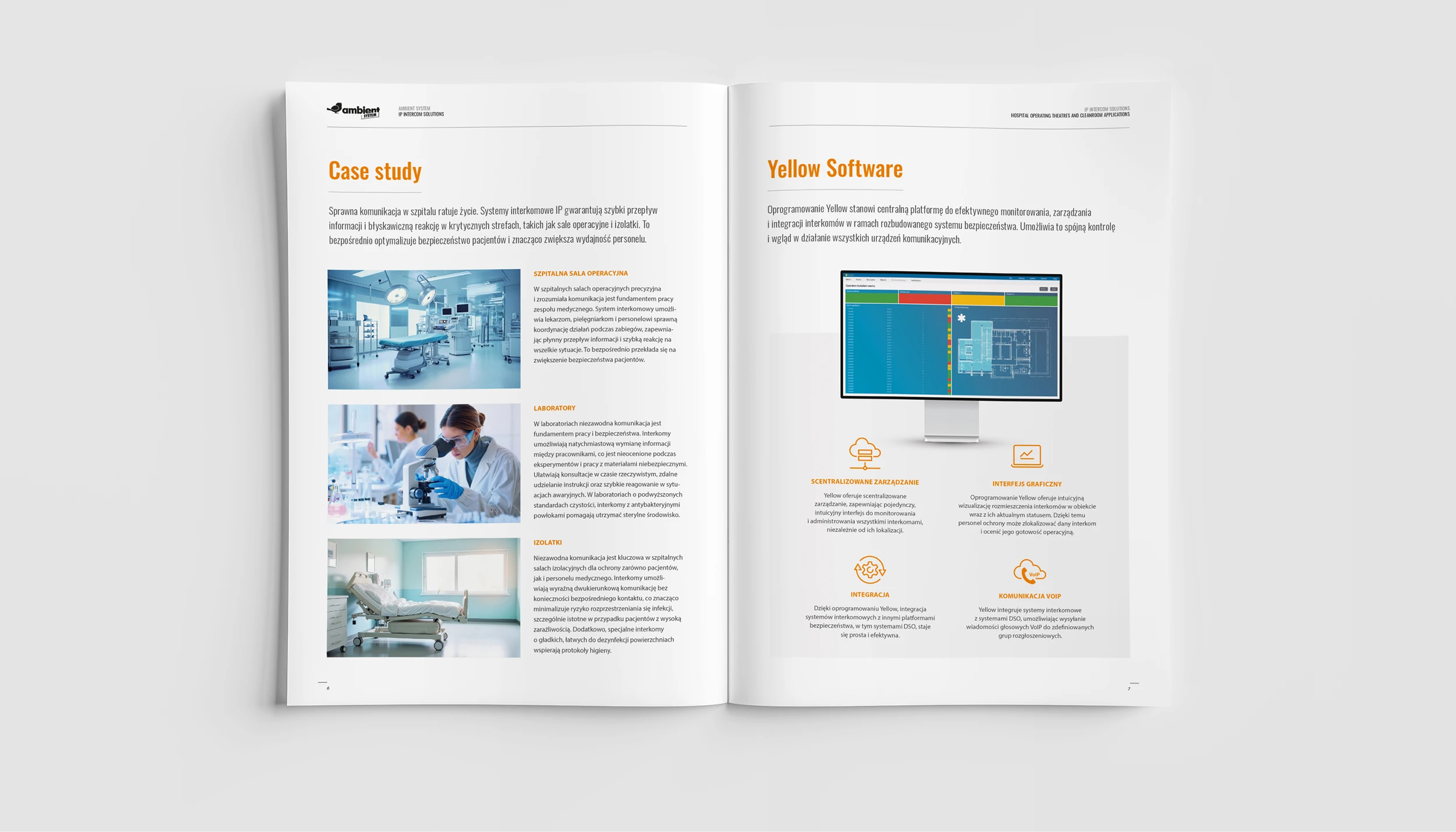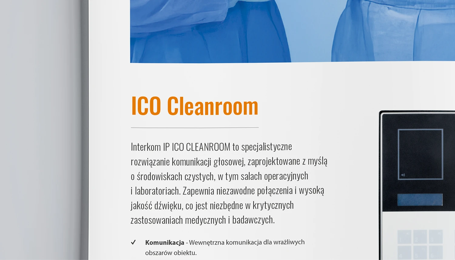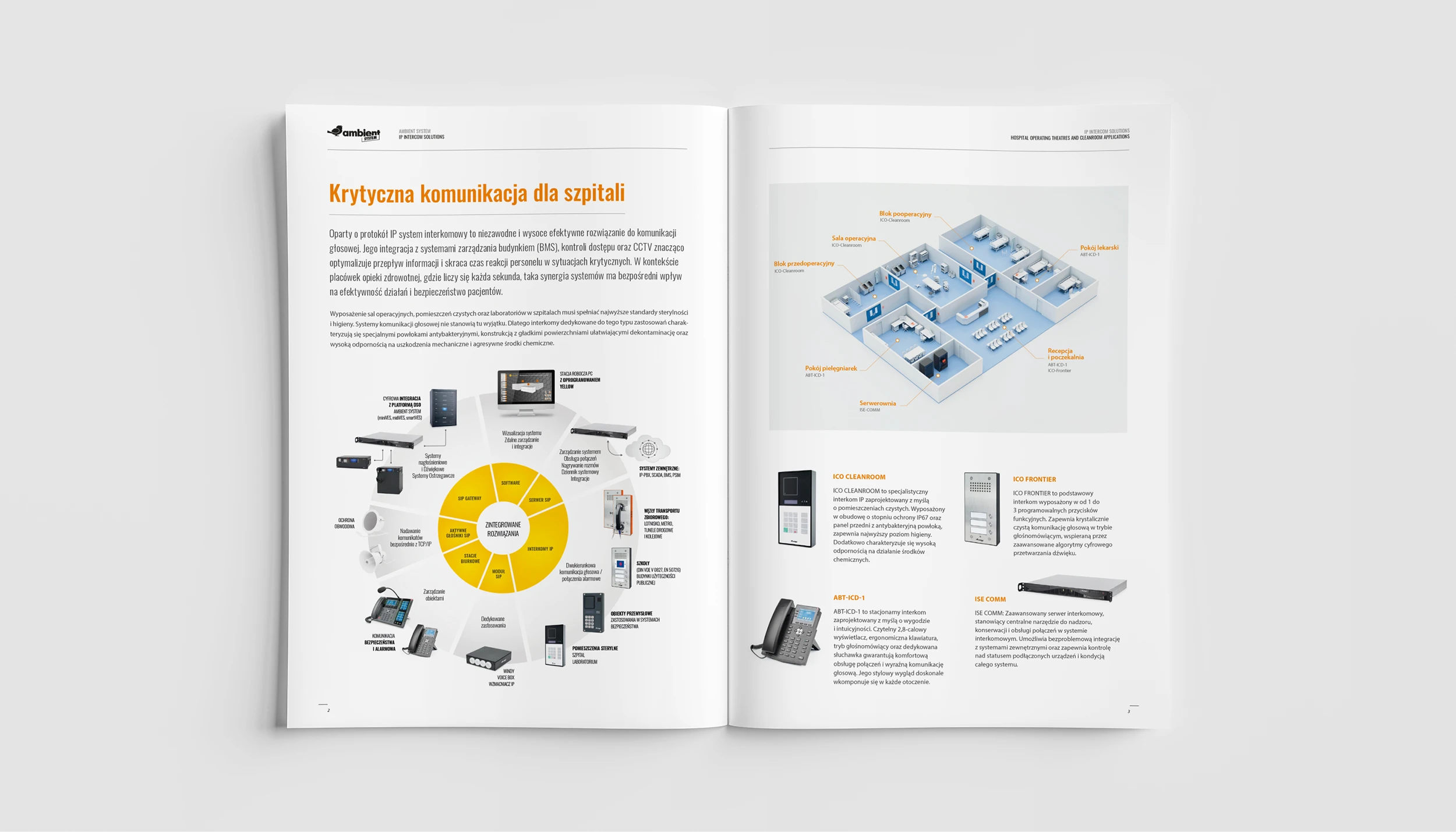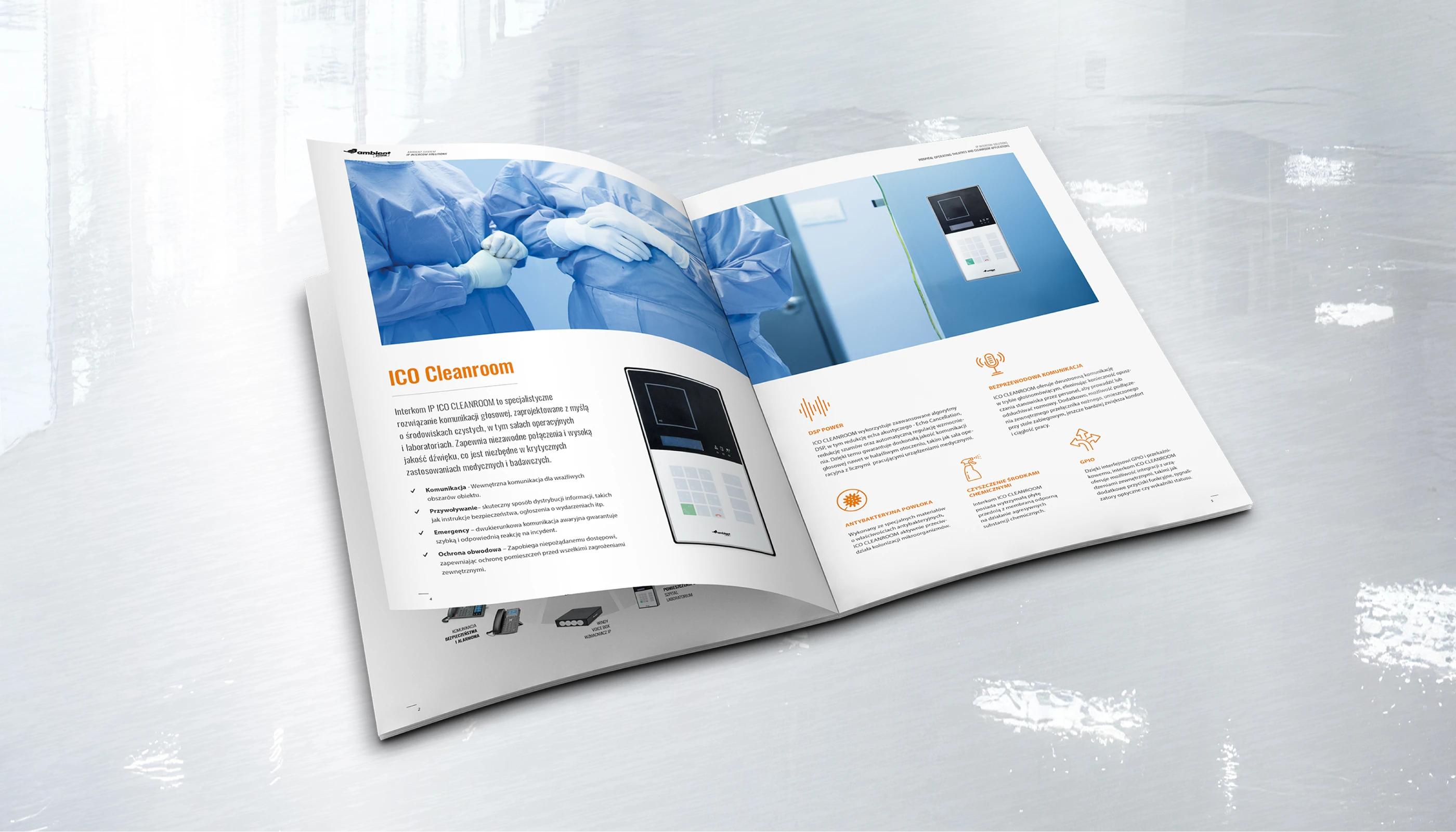 Dotychczasowa współpraca z firmą Ambient System owocowała w wiele ciekawych broszur, które powstały w celu prezentacji produkowanych przez nią produktów z kategorii DSO i Systemów interkomowych. Kolejna z broszur powstała dla interkomu ICO Cleanroom przeznaczonego dla przestrzeni czystych takich jak: laboratoria, czy sale operacyjne.